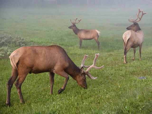 Challenging winter conditions could be hard on wildlife in Yellowstone but greenup in spring and longer warmer days bring new life back into a frenetic pace. While elk shed their antlers in late winter, a plenitude of nutritious grasses fuel rapid re-growth. This photo was taken by Steve Fuller near Hayden Valley not far from the rustic home he inhabited for 51 years.