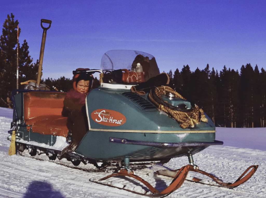 The Fullers’ daughter, Emma, on a Johnson Skee Horse snowmobile. Mechanized horsepower has come a long way in a half century. Earlier iterations of snowmobiles were unreliable, heavy, could get easily stuck in deep drifts and they bear little resemblance to the high-marking rigs that proliferate across more and more of backcountry areas in Greater Yellowstone and the Northern Rockies. Less capable machines, Fuller says, made the solitude of Yellowstone winters more sublime. Photo courtesy Steve Fuller