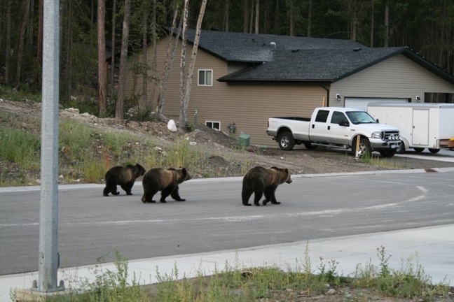 Grizzlies stroll into a subdivision. The chances of bears continuing to survive when their vital habitat is usurped by exurban sprawl diminishes significantly. Not only do such developments serve as catalysts for conflicts, but bears are permanently displaced. Subdivision by subdivision, spreading across private land which connects to public land, results in grizzlies losing a lot of viable terrain necessary to support the existing bear population. A major flaw in the way bear recovery is gauged is ignoring the permanent impacts of development on private land, Servheen says. Photo courtesy Chris Servheen