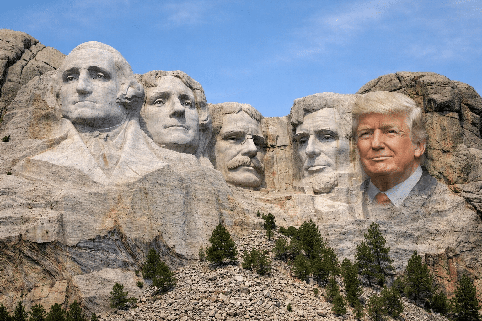 Our President, Donald J. Trump, has fantasized about having his face chiseled into the side of Mount Rushmore, joining George Washington, Thomas Jefferson, Theodore Roosevelt and Abraham Lincoln. He has asserted that his visage deserves to be there since he believes he is the greatest US President ever, just as he says he deserves to win a Nobel Peace Prize for bringing an end to multiple different wars.