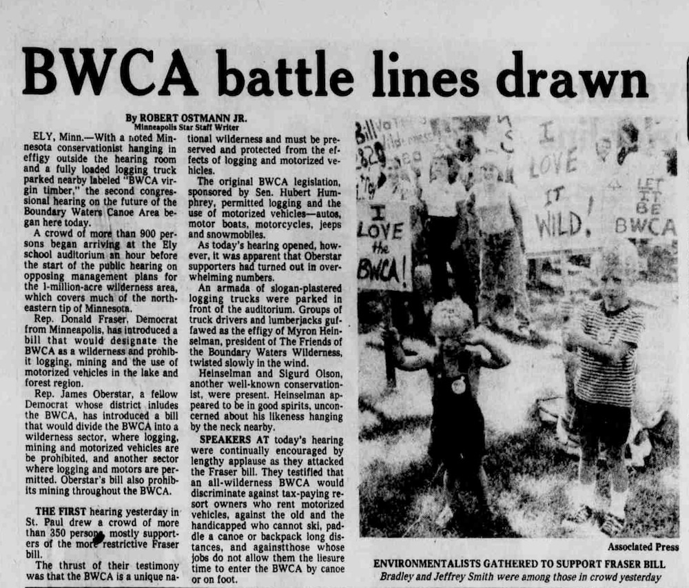 My speech teacher thought it would be interesting for the class to debate the legislation. I was asked to present the pro-wilderness side. The debate took place in the large school auditorium, and all 150 students in my seventh-grade class attended. After the debate, the teacher asked for a show of hands, pro or con. The con won, 148 to 2. My fellow students did not want the Boundary Waters to be protected wilderness. Not long after, when I broke up with my boyfriend, I found that it had become 149 to 1.