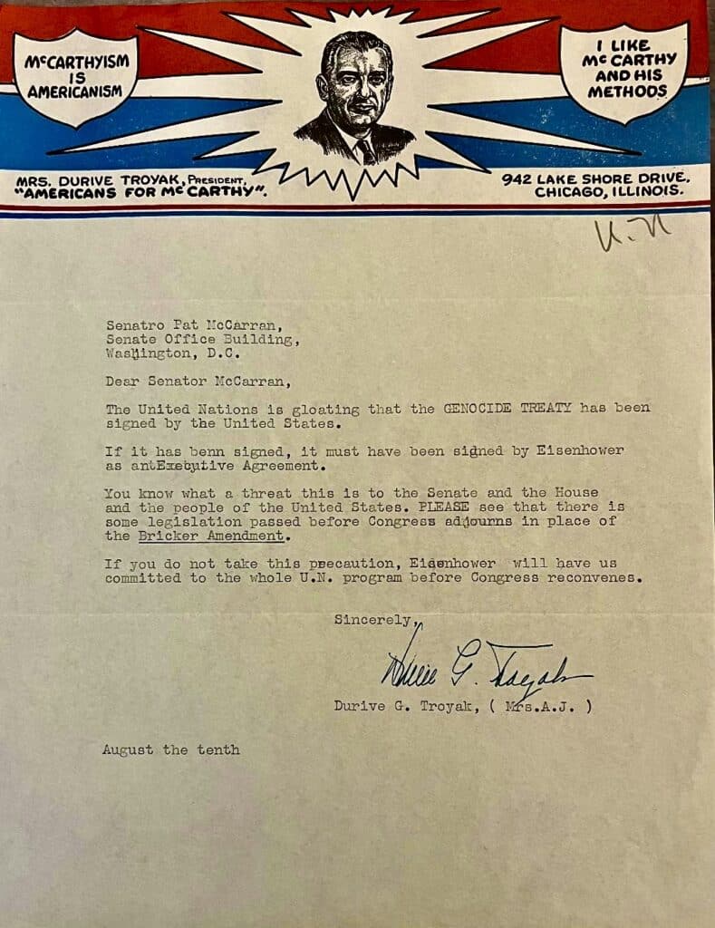 SCHWEBER: McCarran and McCarthy were just as dishonest in their day calling their dissenters “enemies,” “communists,” and “disloyal” as today’s administraiton is uncreative in parroting their language. It is grimly ironic, considering McCarran’s virulent anti-Semitism, that he was the force behind the 1952 immigration law under which Palestinian activist Mahmoud Khalil was just jailed without being charged with a crime, and the snatching off the street of Tufts student Rumeysa Ozturk for having written in her student paper an editorial the administration doesn’t like. Where does violating the Bill of Rights lead us?