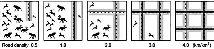 The negative impacts of secondary roads on wildlife are well documented. Widely respected conservation biologist Reed Noss has written extensively about how they degrade habitat quality on public lands. The Federal Highway Administration refers to them in the chapter titled The Ecology of Rural Roads: Effects, Management and Research that is part of a handbook written Tony Clevenger and Marcel P. Huijser of the Western Transportation Institute at Montana State University. The chapter includes the diagram, below from S.K. Luell, showing what happens to wildlife as road density increases.