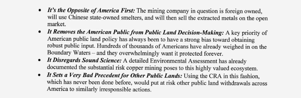 The maneuver, having passed out of the House, is now in the hands of the Senate and, if passed there, would open the door for Twin Metals Minnesota, a subsidiary of a Chilean firm, Antofagasta, to move through the mine approval process. Worthy of note is that both of Minnesota’s US senators, Amy Klobuchar and Tina Smith, stand in opposition to using the CRA as a tool for the Trump Administration giving a foreign mining company the greenlight it seeks. Smith in 2025 introduced the Boundary Waters Wilderness Protection Act that would permanently end the mining threat.