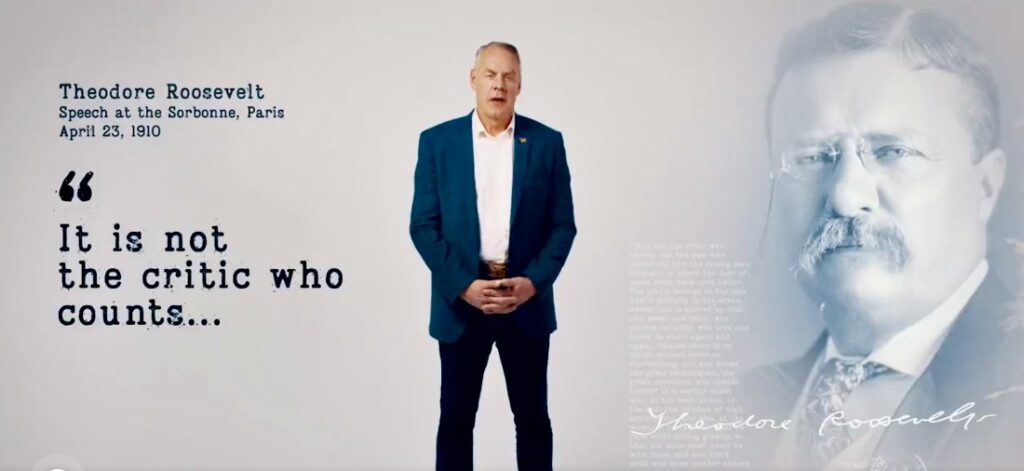 The Theodore Roosevelt Association, keeper of Roosevelt’s true legacy, notes that the larger speech, delivered at the Sorbonne in Paris in 1910, instead outlined something else and far more noble: “TR’s thoughts about the duties and responsibilities of state to citizen and citizen to state. The Man in the Arena passage emphasizes the importance of action and striving towards worthy goals in life over idle criticism, laziness and inaction. A country’s success, TR stated, depends on disciplined work and character, and democracies require leaders of the best character to hold all citizens to the highest standards.”